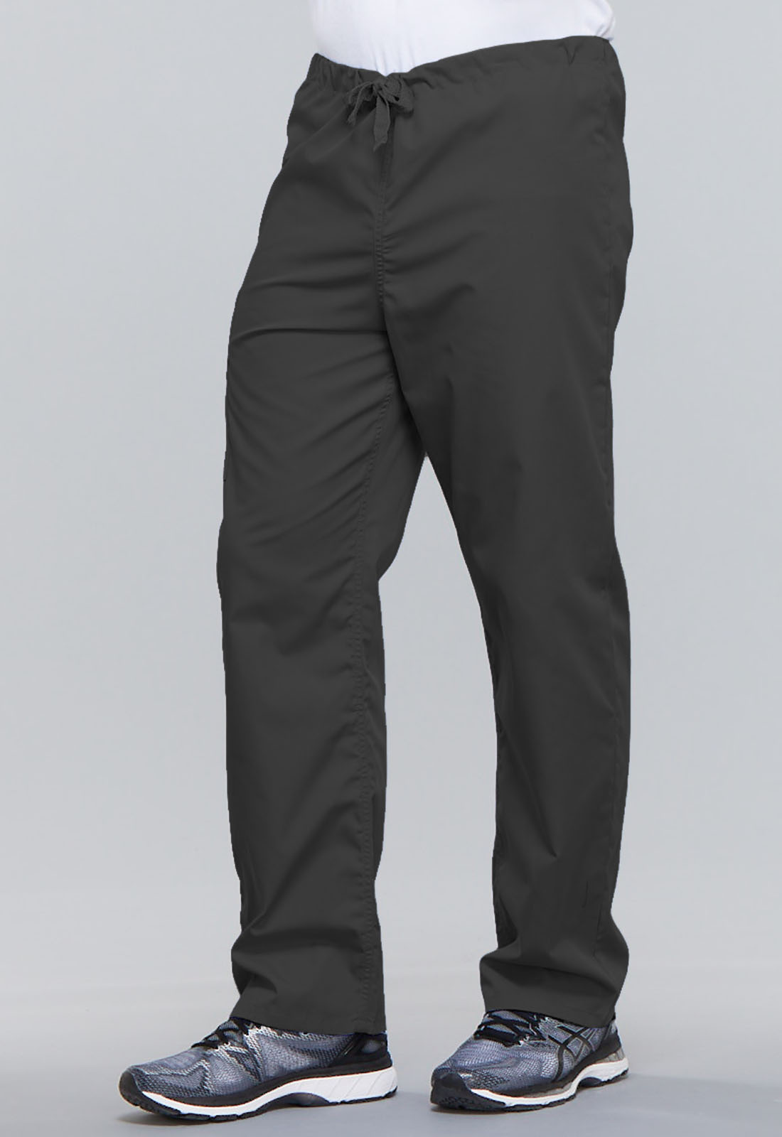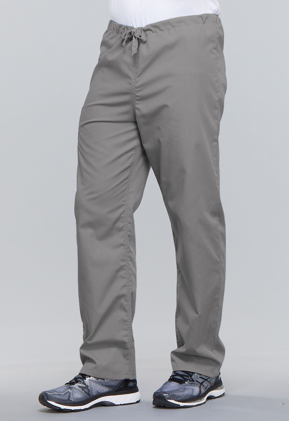 A casual Unisex Traditional fit pant features a natural rise and an adjustable webbed drawstring at the waist, one back pocket, and a cargo pocket with an inside cell phone pocket. Inseam 31".