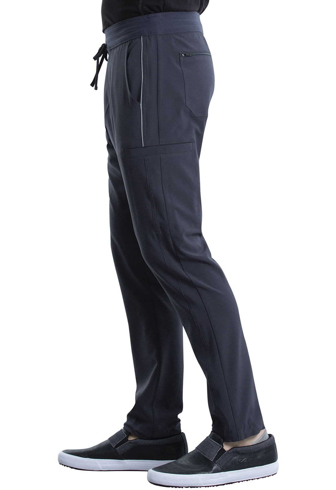 This Men's fit pant has a knit waistband backed with logo elastic and drawstring. Other features include mock fly plus reflective piping on the side seaming ending at the cargo pockets. There are seven pockets in total: two front pockets, two half welt cargo pockets, one hidden cellphone pocket on the wearer's right cargo pocket, and two zip back patch pockets. Interior flat elastic at the leg hem provides versatility. Tapered leg, 15" opening. Inseam: 31 1/2"