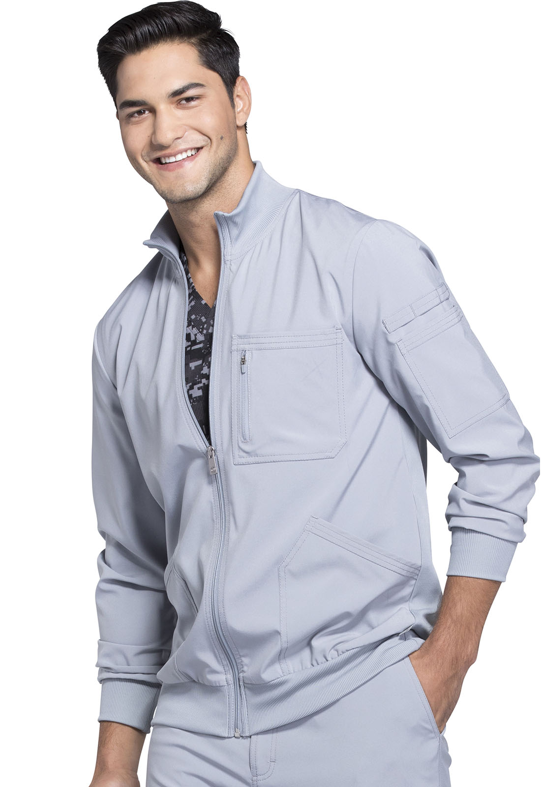 A Men's Athletic fit zip front jacket features back side panels, collar, cuffs and waistband made with a stretch rib knit for extra comfort. Also featured are a logo zipper pull, front chest pocket with security zip closure, patch pockets, and an instrument loop and sectional pocket on the left sleeve. Center back length: 28 . The comfortable stretch poplin fabric and super stretchy rib knit is the perfect combo for healthcare professionals.