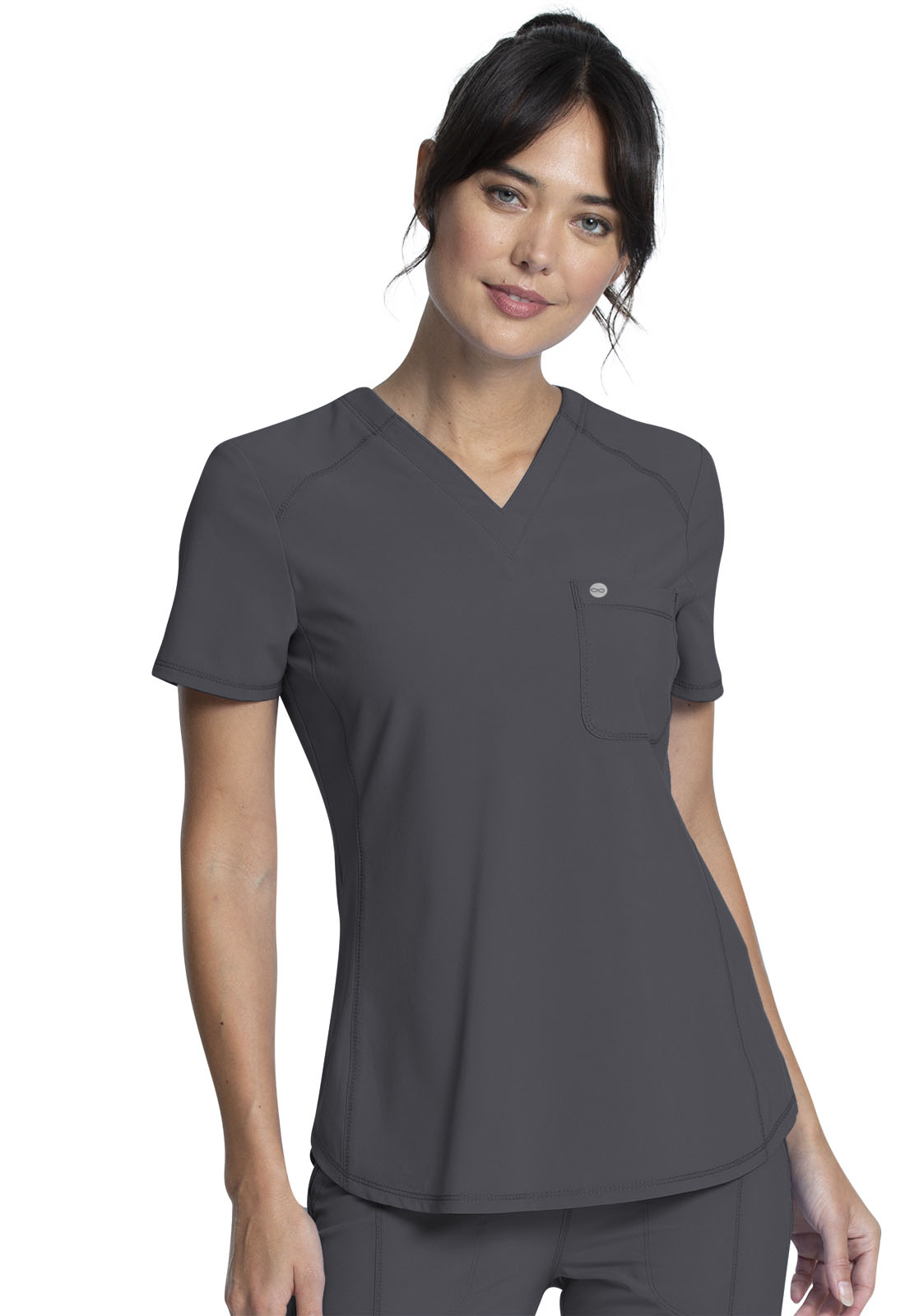 This Contemporary fit v-neck top has rib-knit insets at the neckline. Other features include front and back yoke seams plus front and back princess seams. There is a chest pocket on the wearer's left side. A center back rib-knit panel provides extra comfort and stretch. A shirttail hem and side vents complete the look. This style looks great tucked in or untucked. Center back length: 26"
