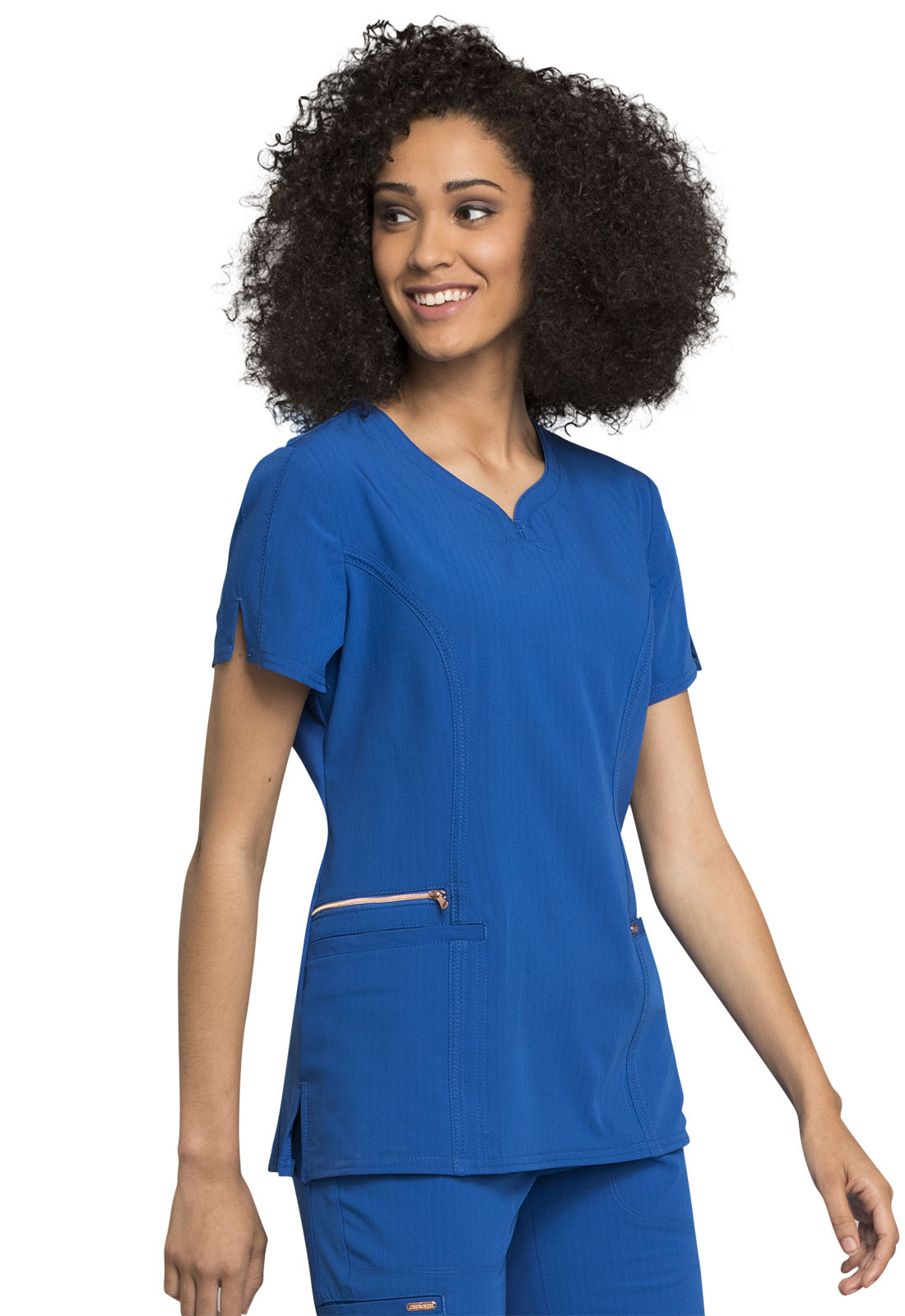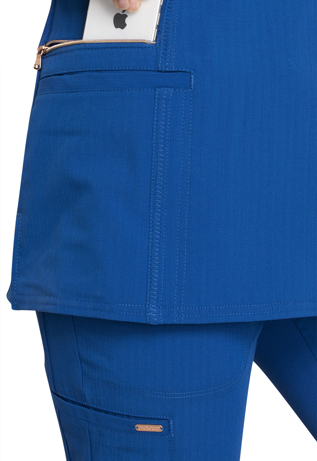 This sophisticated short sleeve top features rose-gold hardware, a curved V-neck, and princess seams at front and back for a slim fit. Knit piecing at the side and center back panels provide added comfort and flexibility. Additional design details include a decorative zig-zag coverstitch at the front seaming, two welt pockets at the waist, a secure zip pocket at the wearer's right, and side vents for ease of movement. Contemporary fit. Center back length: 26". This elegant, linear texture stretch fabric and comfortable jersey knit is a chic pairing for stylish healthcare workers looking to make a STATEMENT.