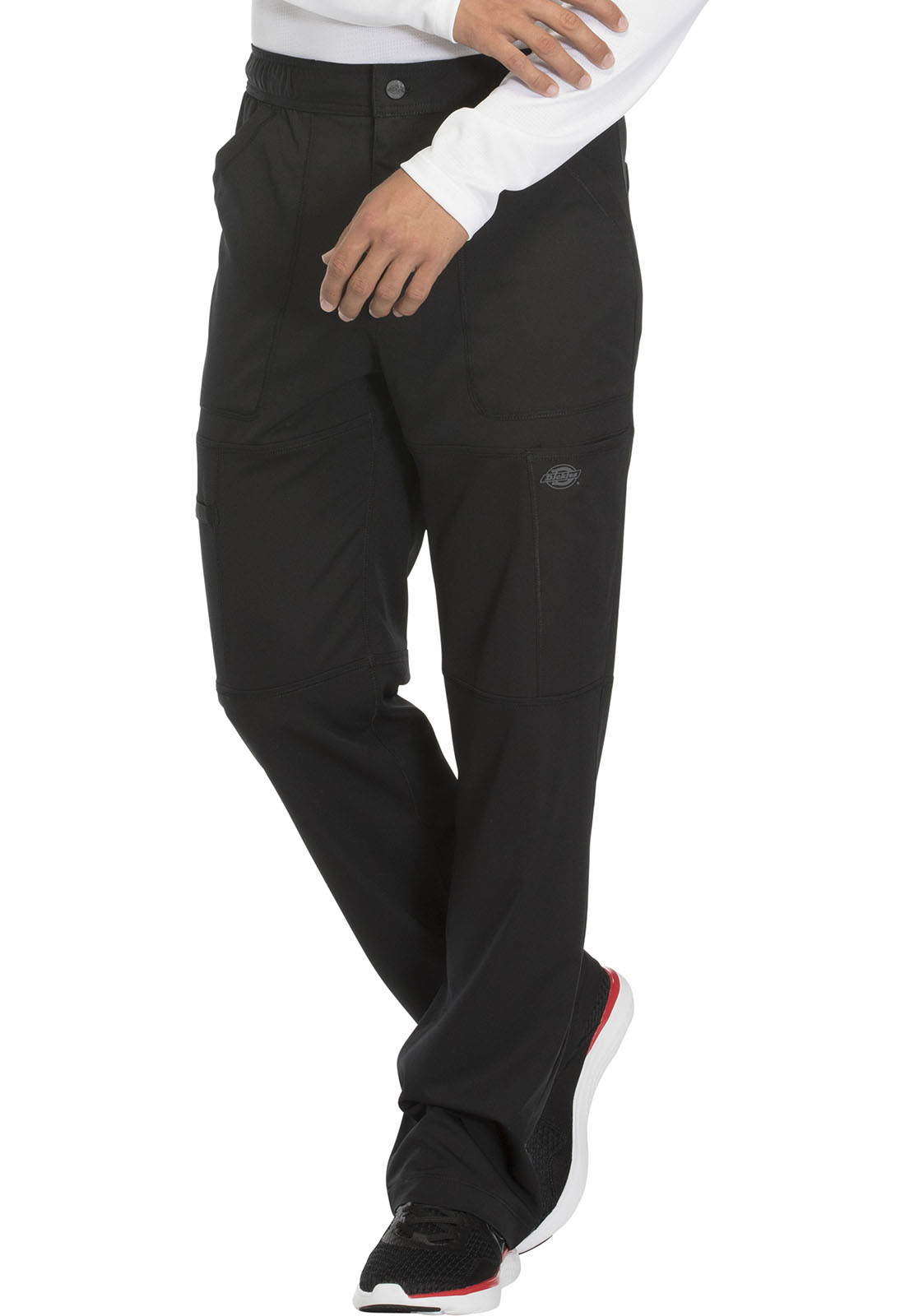 A Men's straight leg pant features a functional drawstring, zip fly with front button closure and a hidden inseam gusset for an easy fit. Also featured are front slash pockets, patch back pockets, cargo pockets (the right with zip closure and instrument loops, the left with a tonal logo heat transfer) and coverstitch detail throughout. Inseam: 32"