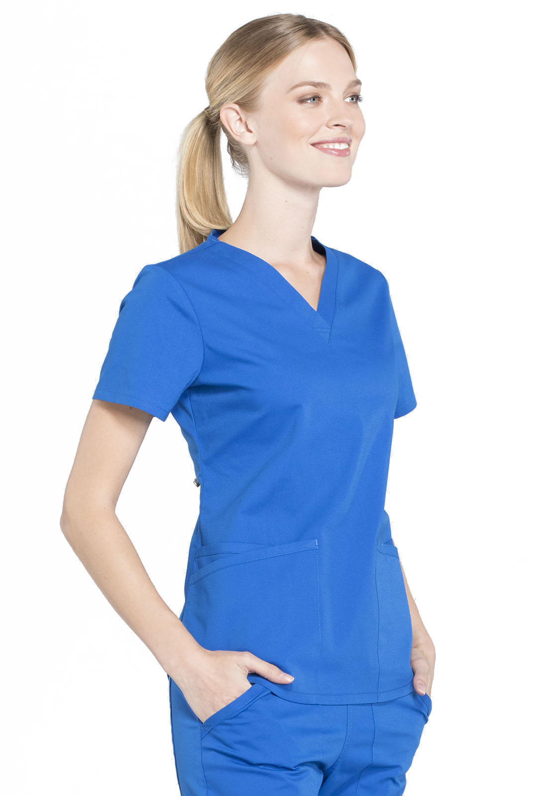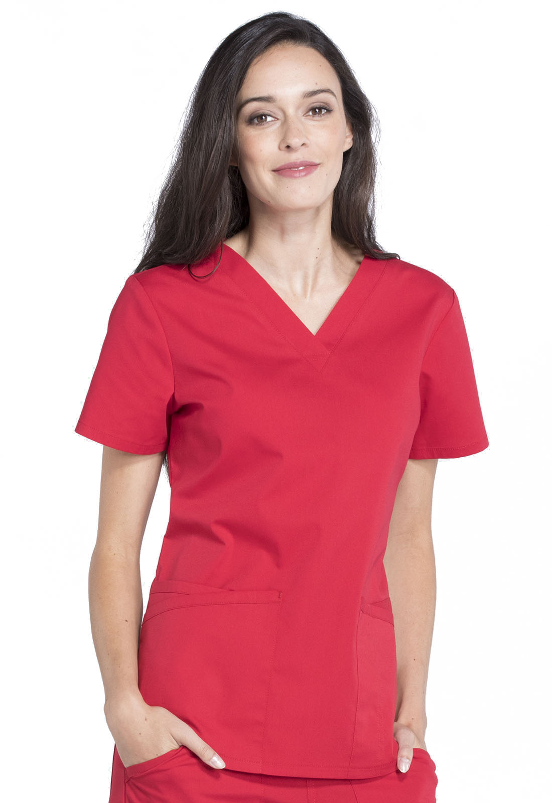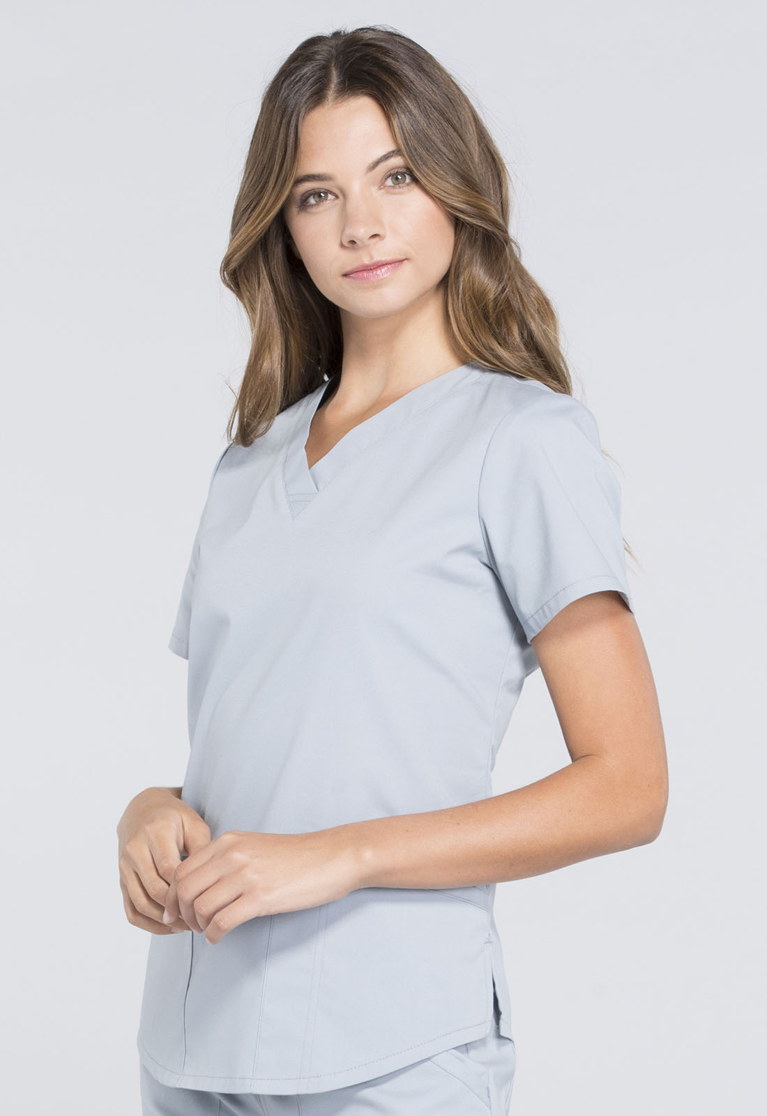 A Modern Classic fit V-neck top features two patch pockets, a cell phone pocket, instrument loop, pencil stitch, back yoke, shirttail hem and side vents. Center back length: 26”
