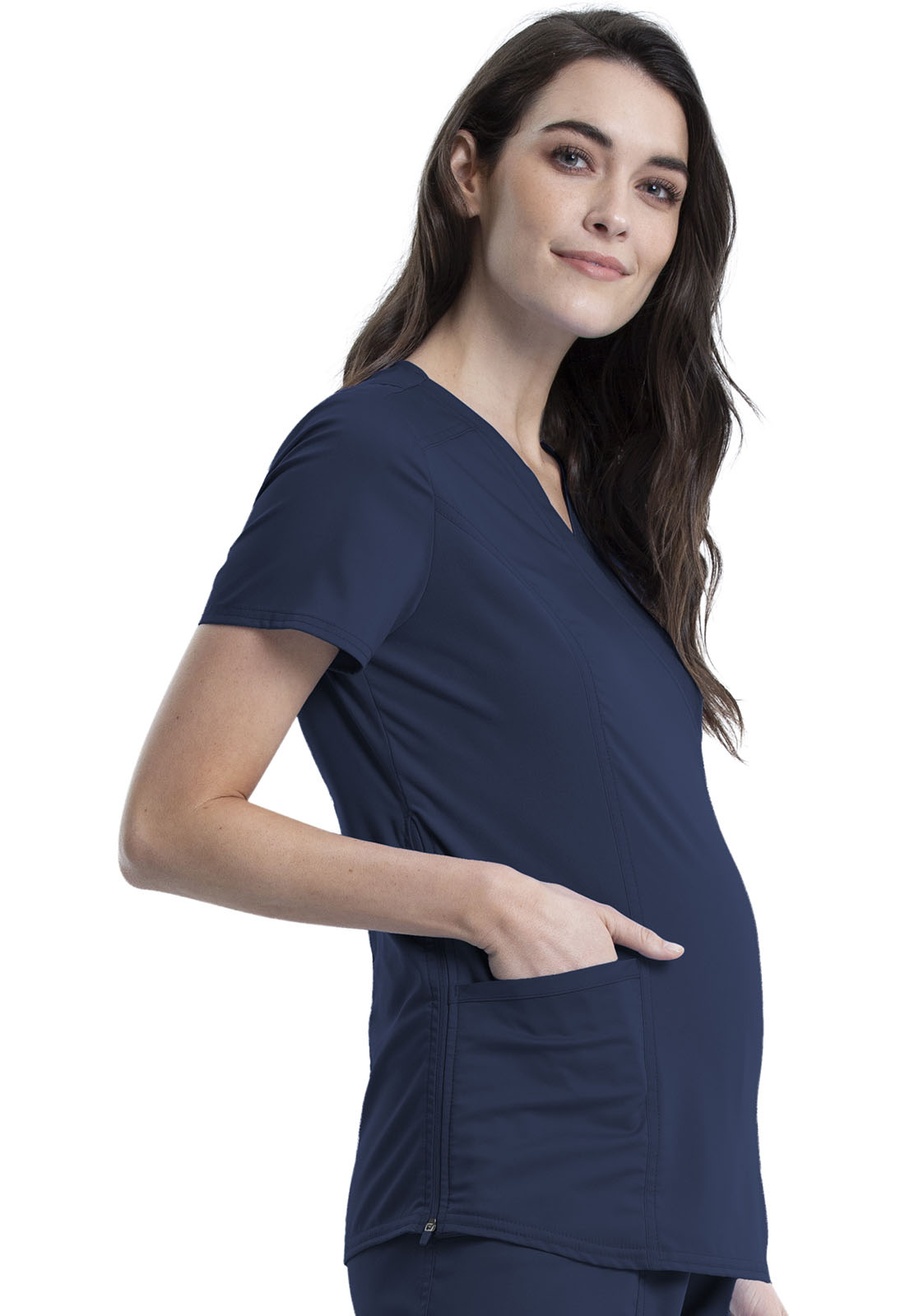 This Maternity fit mock wrap top features front yoke seams, front and back princess seams, a front soft knit panel and two front patch pockets. The top also has side zip gussets with mesh insets which allows room to grow. Center back length: 27"