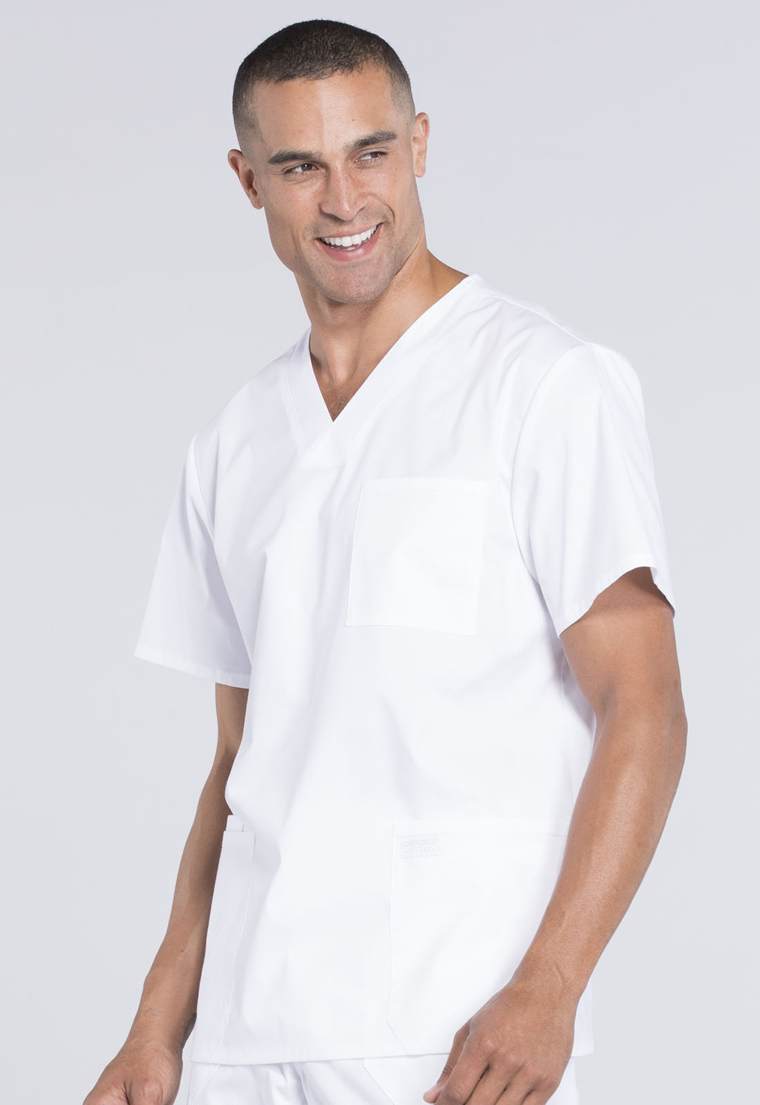 A Men's Traditional fit V-neck top features a chest pocket, two patch pockets, a cell phone pocket, a hidden instrument loop, back yoke and side vents. Center back length: 29"